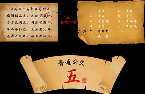 假設(shè)雙方以唐代王勃的《送杜少府之任蜀川》作為解碼密鑰,如果軍隊(duì)需要補(bǔ)充糧食,前方將領(lǐng)就從密碼本中查出“請糧料”的編碼(也就是第九),《送杜少府之任蜀川》中的第九字是“五”,將領(lǐng)就把“五”字寫到一件普通公文中,并在這個(gè)字上加蓋印章。