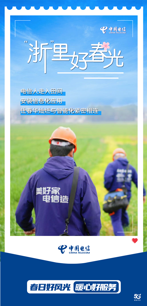 楊柳青青江水平,浙江春色滿城隅。在這春意盎然的時(shí)節(jié),中國(guó)電信浙江分公司深入鄉(xiāng)村,安裝和維護(hù)智能應(yīng)用,為廣大用戶“裝”點(diǎn)美好信息生活。愿我們的5G網(wǎng)絡(luò),如春風(fēng)拂面,讓您隨時(shí)分享生活的點(diǎn)滴,暢享春日好風(fēng)光。