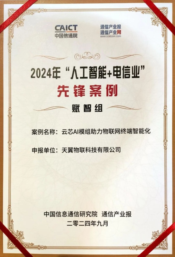 2024年中國(guó)國(guó)際信息通信展覽會(huì)期間,“人工智能+電信業(yè)”領(lǐng)航先鋒典型案例舉行頒獎(jiǎng)儀式,天翼物聯(lián)申報(bào)的“云芯AI模組助力物聯(lián)網(wǎng)終端智能化”案例榮獲先鋒案例。