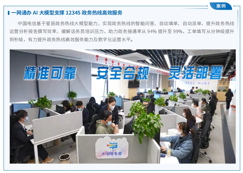 中國電信結(jié)合自身在算力、數(shù)據(jù)、行業(yè)應(yīng)用等方面的優(yōu)勢,依托 AI 能力自主研發(fā)星辰語義大模型,與合作伙伴共同開拓行業(yè)重點(diǎn)場景和細(xì)分場景大模型。構(gòu)建“1+N+M”(1 是通用基礎(chǔ)大模型,N 是行業(yè)大模型數(shù)量,M 是自用大模型數(shù)量)的星辰大模型系列產(chǎn)品體系,面向政務(wù)、教育、交通等垂直領(lǐng)域發(fā)布 12 個行業(yè)大模型。推出“星辰 MaaS(Model as a Service,模型即服務(wù))平臺”,為客戶提供智算算力、通用大模型、行業(yè)大模型、能力工具、數(shù)據(jù)集于一體的大模型服務(wù)。