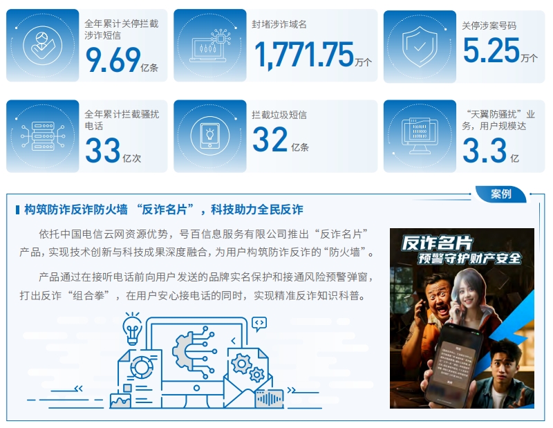 中國電信扎實(shí)開展通信詐騙、騷擾電話和垃圾短信的綜合治理。通過持續(xù)提升技術(shù)防范能力、加強(qiáng)重點(diǎn)業(yè)務(wù)監(jiān)測處置等措施,全年累計(jì)關(guān)停攔截涉詐短信 9.69 億條,封堵涉詐域名 1,771.75 萬個,關(guān)停涉案號碼 5.25 萬個,開展線上線下一體化防詐宣傳,累計(jì)觸達(dá) 2,700 萬人次。通過開展合規(guī)性管控、持續(xù)提升技術(shù)防范能力、為用戶提供按個人意愿攔截騷擾電話服務(wù)等措施,全年累計(jì)攔截騷擾電話 33 億次,攔截垃圾短信 32 億條,“天翼防騷擾”業(yè)務(wù),用戶規(guī)模達(dá) 3.3億。中國電信騷擾電話、垃圾短信被舉報(bào)量持續(xù)保持行業(yè)低位。