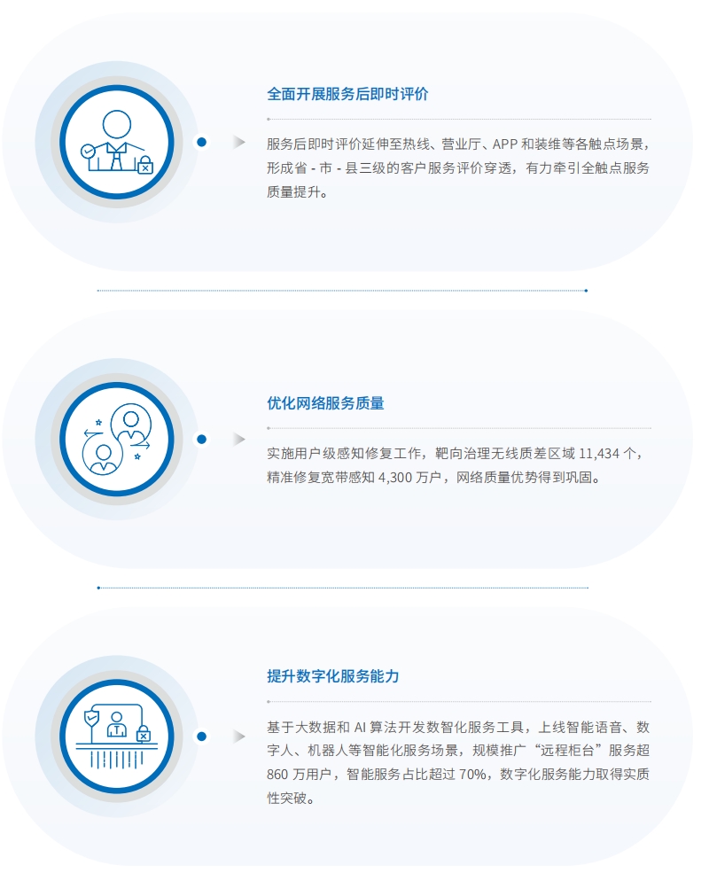 中國電信堅(jiān)持客戶導(dǎo)向,將客戶感知作為一切工作的出發(fā)點(diǎn)和落腳點(diǎn),不斷完善“客戶說了算”服務(wù)機(jī)制和服務(wù)流程,數(shù)字化、智能化服務(wù)能力不斷增強(qiáng),客戶感知和服務(wù)口碑持續(xù)向好。