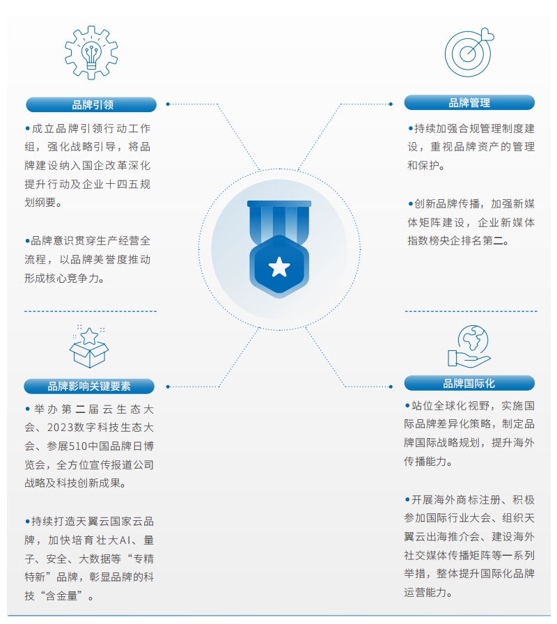 2023 年,中國電信以品牌引領(lǐng)行動為抓手,打造管理科學(xué)、價值領(lǐng)先、行業(yè)領(lǐng)軍的卓著品牌,以品質(zhì)鑄造品牌,以品牌推動發(fā)展。持續(xù)強(qiáng)化企業(yè)品牌運(yùn)營能力,不斷形成品牌競爭新優(yōu)勢,強(qiáng)化服務(wù)型、科技型、安全型的企業(yè)品牌內(nèi)涵。持續(xù)打造完善的品牌建設(shè)體系、成熟的品牌推廣能力和先進(jìn)的品牌國際化運(yùn)營模式,印發(fā)《中國電信對標(biāo)世界一流企業(yè)品牌引領(lǐng)行動實(shí)施方案》,推進(jìn)落實(shí)品牌引領(lǐng)、品牌管理、品牌影響關(guān)鍵要素和品牌國際化四大舉措。