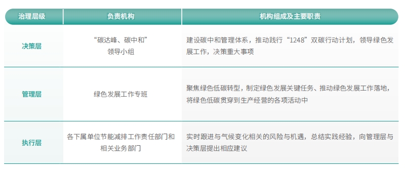 中國電信在“碳達峰、碳中和”工作領導小組帶領下,由董事長擔任領導小組組長,負責領導小組日常工作,推動中國電信落實綠色低碳戰(zhàn)略。中國電信設置了決策層、管理層和執(zhí)行層三層治理結構,推動落實綠色低碳發(fā)展。