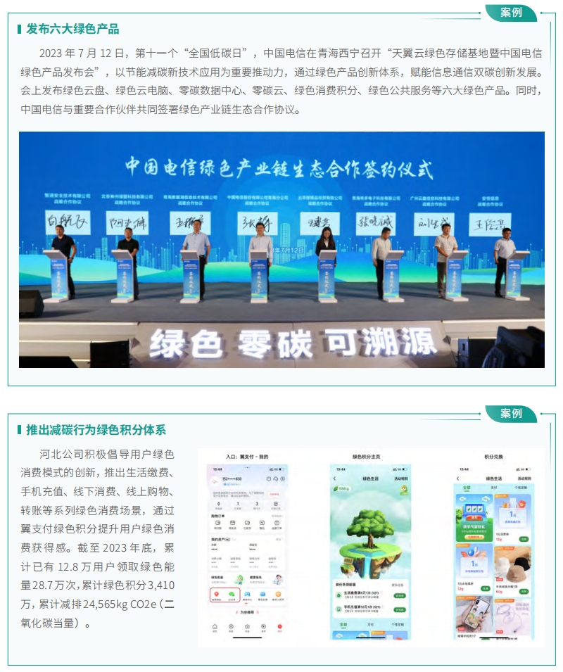 中國電信加快完善綠色產品與服務體系,通過云網基礎設施的綠色轉型為產品與服務注入綠色要素,推動形成綠色低碳生活方式,引領綠色消費。